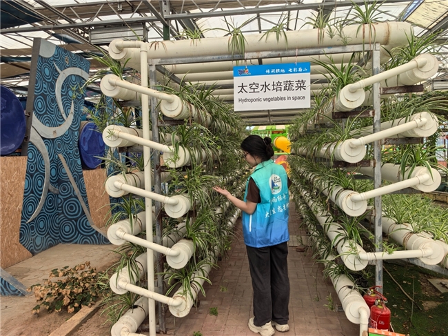 (團隊成員在觀察大連旅順小南村大連旅順小南村觀察太空水培蔬菜。大連外國語大學“藍嶼綠舟”大連生態先鋒隊供圖)